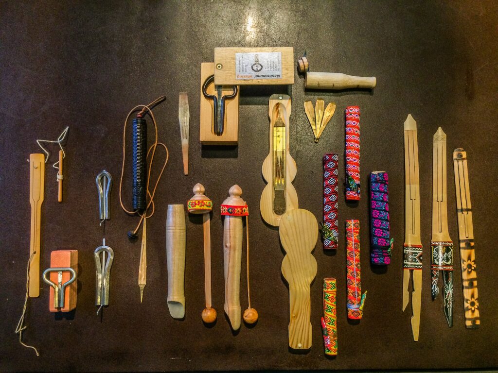金属や竹、木などで作られた楽器で、弾力のある弁を指で弾いたり紐を引いたりして振動させ、奏者の口の中を共鳴させて音を出す楽器です。口の中の空間や息の吹き方を調整することで音色や音程を変化させることができ、ユーラシア大陸を中心に世界中に分布しています。